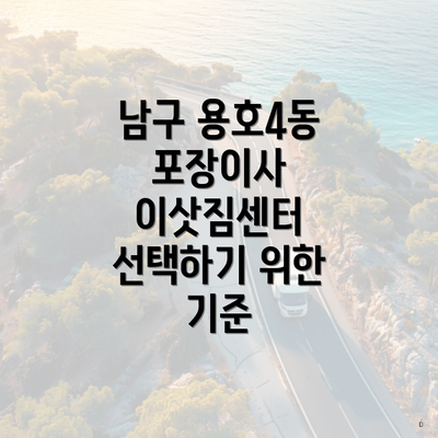 위의 기준들을 바탕으로 남구 용호4동 지역에서 이삿짐센터를 선택한다면, 보다 효율적이고 만족스러운 이사 경험을 할 수 있어요. 안전하고 신뢰할 수 있는 이사 업체를 선택하는 것이 여러분의 소중한 시간을 절약해 줄 거예요!