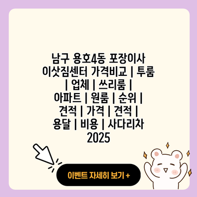 이사할 때면 누구나 겪는 고민이 있습니다. 바로 이삿짐센터를 선택하는 것입니다. 선택의 폭이 넓어지면서 고객들은 더 좋은 서비스를 제공받고 싶어 하지만, 경쟁이 치열해지면서 가격과 서비스 수준이 다양하다는 사실은 혼란을 초래하기도 합니다. 더욱이, 2025년을 맞이하여 이사는 더욱 복잡해질 것으로 예상됩니다. 그러므로 이 포스팅에서는 남구 용호4동에서의 포장이사 이삿짐센터 가격비교를 통해 최적의 업체를 선택하는 방법을 알아보겠습니다.