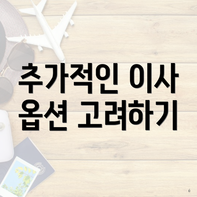 이사할 시 이러한 추가 옵션들은 시간과 비용을 절약해줄 뿐 아니라, 당신의 스트레스를 줄여줄 거예요. 각 옵션의 필요성은 사람마다 다를 수 있으니, 본인의 상황에 맞는 도움을 요청하는 것이 가장 좋답니다. 이러한 고려사항을 잘 살펴보면 보다 원활하게 이사 과정이 진행될 수 있어요.