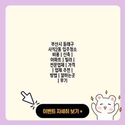 입주청소는 새로운 시작을 깨끗한 공간에서 시작할 수 있게 도와주는 중요한 과정이에요. 따라서, 올바른 내용을 바탕으로 적정한 비용의 청소 서비스를 선택하는 것이 필수적이에요. 부산시 동래구 사직2동에서 입주청소를 원하신다면, 단순히 가격 비교만 하지 마시고, 전문가의 도움을 받는 것이 정말 중요하다는 점을 기억해 주세요.